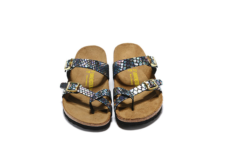 Birkenstock Black Snakeskin Reflective Double Buckle Toe-Loop Leather Sandals