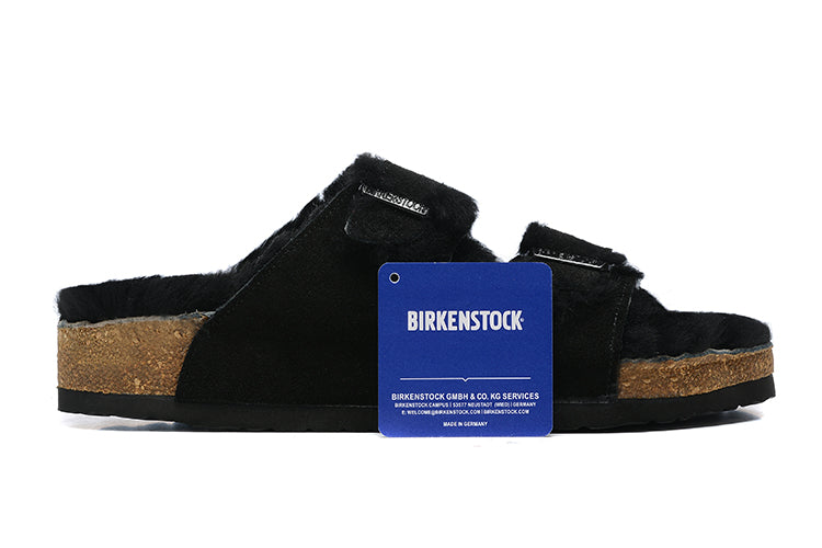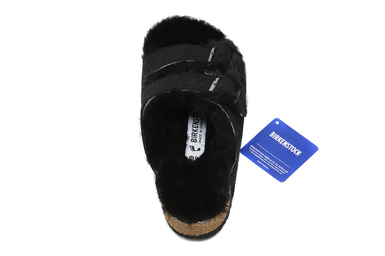 Birkenstock Two-Button Black Scrub Leather Black Fur Lining Slippers